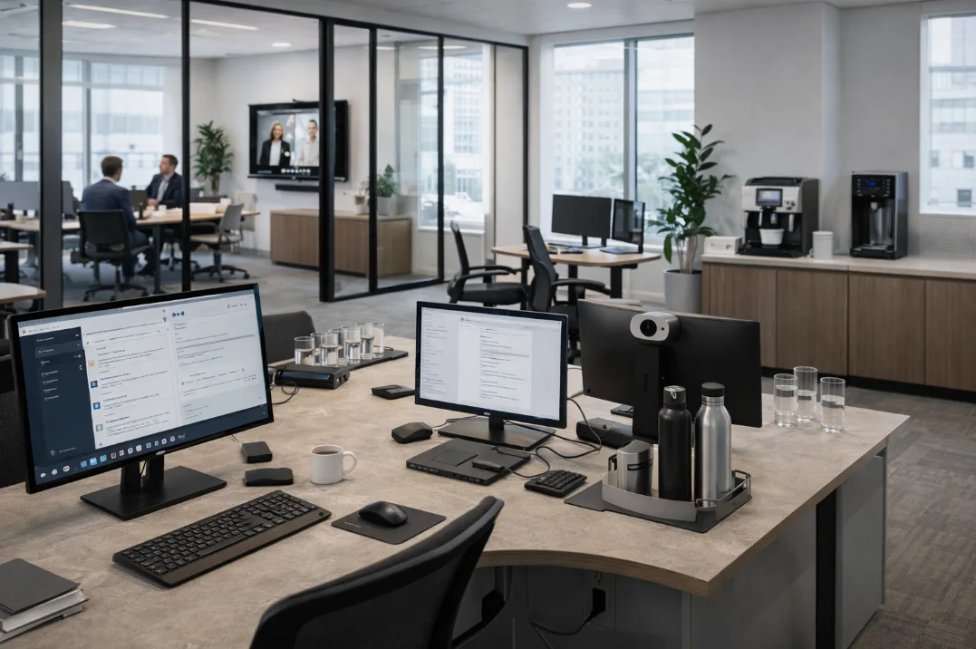 When laptops, tablets, docks, room systems, coffee equipment, and hydration are planned together, three things improve: