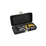 Set uključuje 13 nasadnih ključeva od 4 do 14 mm, dva nastavka za ključeve dužine 50 i 100 mm, klizajuću T ručku, zglobnu spojnicu i čegrtaljku sa 72 zuba. Tu su i ravni i krstasti bitovi, kao i hex bitovi različitih dimenzija. Sve je upakovano u praktičnu metalnu kutiju dimenzija 235 x 110 x 45 mm, što omogućava lako skladištenje i transport.