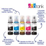• Tip: Multifunkcijski inkjet • Boja: U boji • Funkcionalnost: 3-u-1 (štampač, skener, kopir) • Sistem štampe: Epson Micro Piezo • Rezolucija štampe: 5.760 x 1.440 dpi • Duplex štampa: Ne • ADF kapacitet: 30 strana Brzina štampe • Monohromatska štampa: 33 ppm • Štampa u boji: 15 ppm • Štampa fotografija (10x15 cm, Premium Glossy): 27 sekundi Skeniranje • Senzor: CIS • Brzina skeniranja monohromatski: 11 sekundi • Brzina skeniranja u boji: 28 sekundi • Rezolucija skeniranja: 1.200 x 2.400 dpi • Podržani formati: PICT, BMP, JPEG, PNG, TIFF Format papira • Podržani formati: 10 x 15 cm, 13 x 18 cm, A4, A5, A6, B5, C6 (koverta), DL (koverta), Letter, No. 10 (koverta), korisnički definisani Povezivost • USB • Wi-Fi • Wi-Fi Direct Potrošni materijal • Toner/Mastilo: 103 EcoTank • Inicijalni toner (crni): 8.100 strana • Inicijalni toner (u boji): 6.500 strana • Regularni toner (crni): 8.100 strana • Regularni toner (u boji): 6.500 strana Ostale funkcije • Emulacije: ESC/P-R • Kapacitet fioke: 100 listova • Podržana debljina papira: 64 g/m² – 300 g/m² Fizičke karakteristike • Dimenzije: 375 x 347 x 179 mm • Težina: 3.9 kg • Boja uređaja: Crna • Pakovanje: 5 bočica (2x Crna, Cyan, Žuta, Magenta)