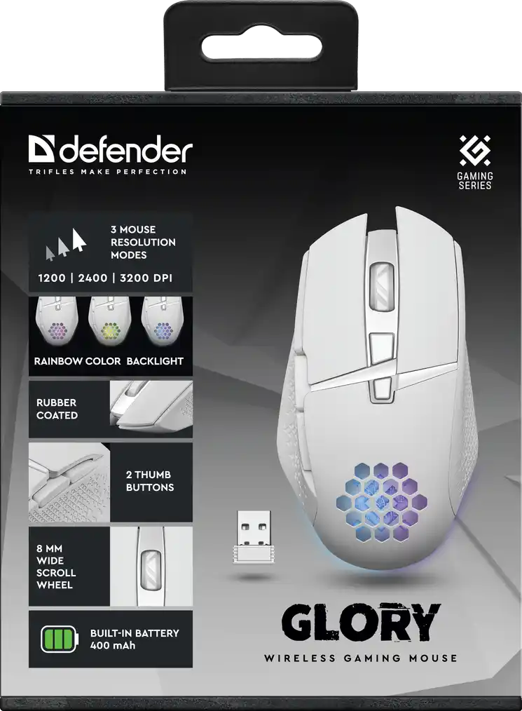 Defender Glory GM-514 White ima šest tastera i točkić za skrolovanje, što omogućava lako upravljanje i brzi pristup funkcijama. Bežični interfejs preko USB-a pruža slobodu kretanja, dok je kompatibilan sa Windows i Mac operativnim sistemima.
