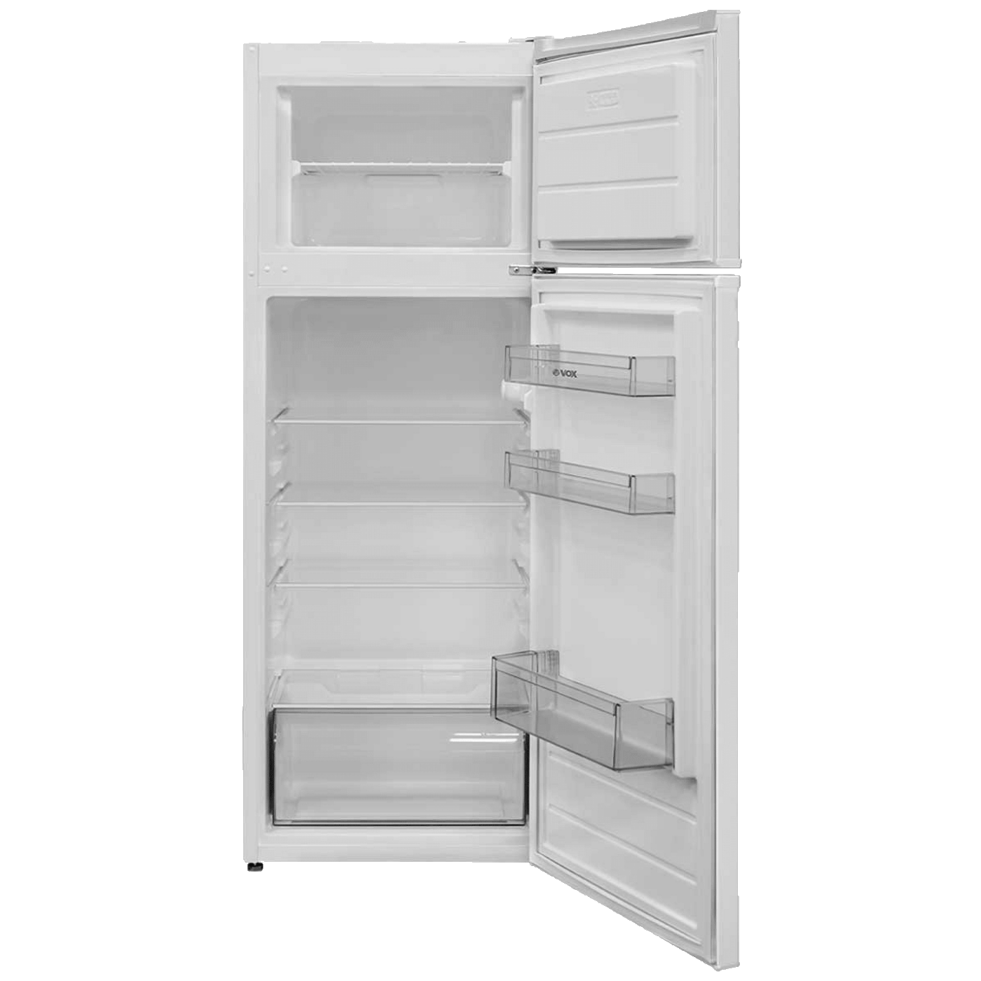 Vox KG2500E je kombinovani frižider koji nudi praktično rešenje za čuvanje hrane sa ukupnom zapreminom od 213 litara. Ovaj frižider omogućava efikasnu organizaciju namirnica zahvaljujući četiri police u frižiderskom delu i jednoj u zamrzivaču, pružajući lak pristup hrani.