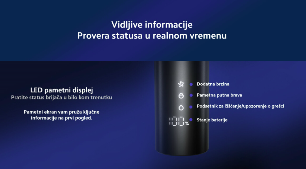 Ovaj brijač nudi glavnu prednost u vidu dugotrajne baterije koja omogućava do 90 minuta rada uz brzo punjenje od samo 60 minuta, čineći ga idealnim za svakodnevnu negu i putovanja.